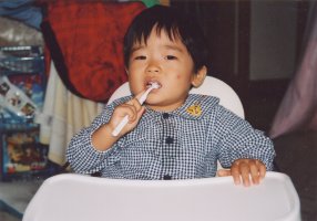 食後の歯磨きはしっかりしようね。 自分で歯ブラシを口に入れていますが まだ自分では磨けません。 口に入れて遊んでるだけなんです〜。 |