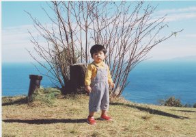 近くの山の山頂にて、伊豆の海を バックに。初めてこんなに高い所に来て しかもまわりがほとんど海なので 恐かったらしく、この後、 足がガクガク震えだし 大声で泣き出しました。(>_<) |