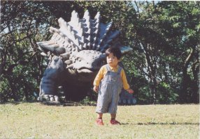 同じ山に「恐竜広場」と言う所があって 恐竜の近くでぴよぴよの写真を撮ろうと したのですが、恐竜が恐かったみたいで 恐竜に近づけたら泣いてしまいました。 |