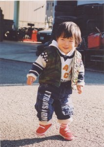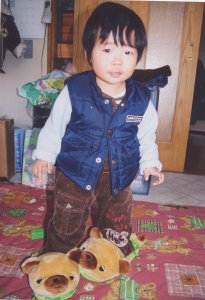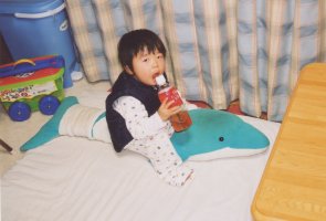 パパが普段枕として使っている イルカの抱き枕にまたがって…。 (イルカに乗った少年だ〜。(^_^;)) |