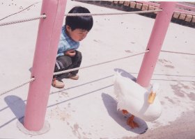 アヒルちゃんと見つめ合うぴよぴよ。 親に似て、鳥好きなようです。 (もちろん他の動物も好きですよ〜。) |
