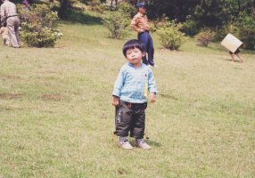 緩やかな傾斜の芝生の上で ぴよぴよを呼んだら、 少し首を傾けながら こっちを向きました。 |