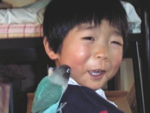 ビスケが突然自分の肩に飛んできて 嬉しいやら、なにやら おっかなびっくりな顔?してます。 |