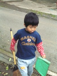ホウキとちりとりを持って 庭のお掃除。 エライエライ! |