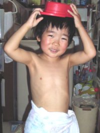 お風呂上がりにおもちゃを持って ポーズ! 早く着替えないと 風邪引くよ〜。 |