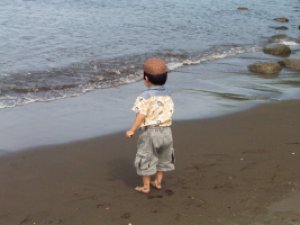 近くの海へ遊びに行きました。 波が行ったり来たりするのが 恐いらしく、なかなか海に 入ろうとはしませんでした。 |