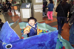 日曜日の市役所で、はじめての 保育祭りが開催されました。 演劇や本の読み聞かせ、 遊びのコーナー、工作のコーナー等 いろいろなイベントがありましたが ここが一番気に入ったようで かなり長い時間ここにいました。 |