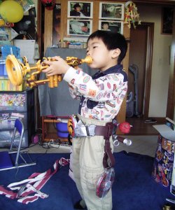 現在放送中の、仮面ライダー響鬼に 登場する、響鬼の仲間「威吹鬼」の 武器で、パパを攻撃中です。(^^;) ベルトも、人気のディスクアニマルも 腰につけ、仮面ライダーに なりきってます。 |