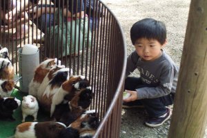モルモットに餌をあげているところ なのですが…。 ものすごい数のモルモットが ぴよぴよに「餌ちょ〜だい!」と ねだっています。(^^;) |