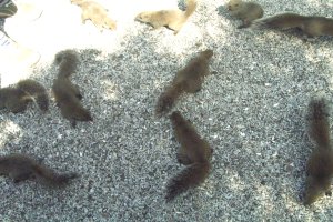 | こちらは、放し飼いにされている リスたちです。 餌の、ひまわりの種を持っている人に 近づいてきて、肩に乗ったり、 足をよじ登ったり、餌がなくなるまで 帰ってくれません。 私もかなり、リスの爪で傷だらけに なりました。(>_<) ぴよぴよも最初は喜んでいましたが リスが自分に近づいてきたら 怖がって泣きました。 |