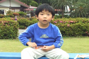 近くの芝生の公園にて。 サッカーをやりに来たのに 「つかれた〜。」と言って すぐに座ってしまいます。 (実は、グミが食べたいだけ だったりして…。) |