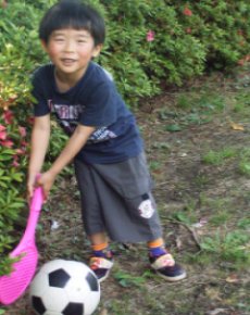 ラケットを持って、何を打つかと 思えば…サッカーボール? それはちょっと…、無理じゃないかしら。 |