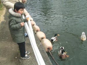 ここのカモはとても 食いしん坊で(^^;) ジャンプまでして 「エサちょうだ〜い!」と 集まってきます。(^^;) |