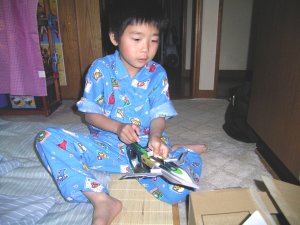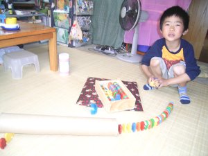 雑誌の付録で付いていた 紙製の新しい仮面ライダーの おもちゃで遊んでいます。 |