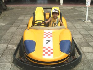 ぐらんぱる公園入り口に かっこいい車が置いてあり 「ここで写真撮って〜!」と ぴよぴよが言ったので パチリ! でも座ってる所は 運転席ではないですね〜。(^^;) |