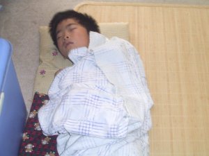 布団を片づけたら…、 座布団を自分で並べて タオルケットにくるまって また寝てしまいました。(^^;) |