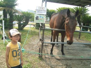 馬に人参をあげた直後の 写真ですが…、 馬もぴよぴよも距離が 微妙な感じですね。(^^;) |