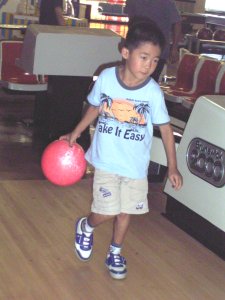 初めてのボーリングです。 球は、右に左に 忙しそうに曲がっていましたが 初めてにしては スコアは割といい方でした。 |