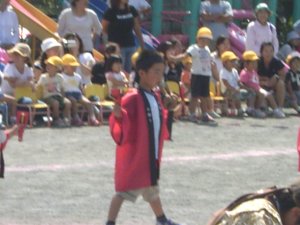 | 年長組さんの演技、 「よさこいソーラン」を 踊りました。 なかなかさまになっていて かっこよかったです。 |