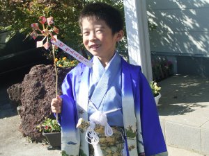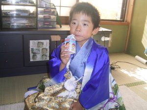 七五三の衣装を着て 写真をパチリ! なかなかさまになっています。 |