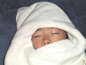 朝、目覚ましが鳴って 一度起きてきたのですが… 居間でまた横になって モコモコの上着を体に、 と言うか顔に(^^;)かけて また寝てしまいました。(>_<) |