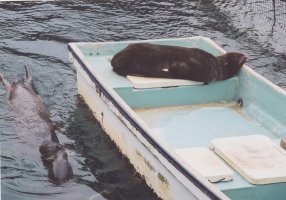 | イルカのショーが終わり、次のショーが 始まるまで、あちこち歩き回っていたら、 ボートに乗ったアシカ発見!! 気持ちよさそうにお昼寝しているアシカの 横では、「ちゅっv」ってやってる アシカが…。(^_^;) |