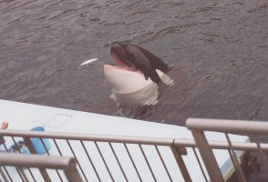 シャチの餌付けです。 真っ白で大きなお腹を見せてくれたり 鳴き声を聞かせてくれたり 最後には、手?を振ってくれたりと とても器用なシャチでした。 |