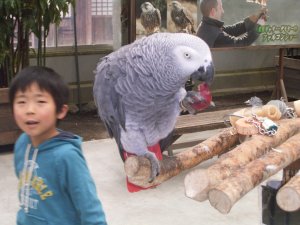 | 我が家ではもうおなじみの ヨウムです。 この子はあまりかまって欲しくないようで ブドウを食べたり、毛繕いをしたり マイペースでした。 |