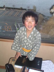 宿に着いて、浴衣に 着替えました。 後ろは浜名湖です。 |
