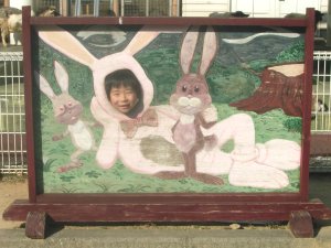 ふれあい広場のウサギのケージの前に このようなボードが…。 ノリノリのぴよぴよは 自分から顔を出していました。 |