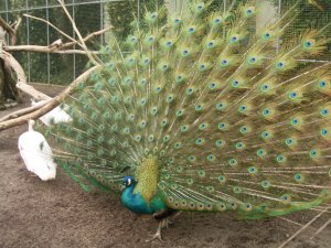 ここのクジャクは、サービス精神が 旺盛なようで、人がカメラを向けると このように 羽を広げてくれます。 |