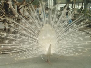 | 白いクジャクもきれいです。 羽の後ろに立って、 記念写真を撮っている人も何人か いました。 |