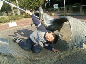| 同じく動物園の鳥の銅像の前で。 なんだか鳥に 襲われているようにも 見えますが…。(^^;) |