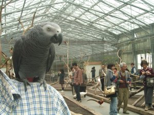 さっきの子と違い、この子は とても人になれていました。 たくさんお客さんが来ていましたが 肩に乗せている人は なかなかいませんでした。 さすがはヨウム使いのとしです。(^^;) |