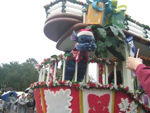 | この日はあいにくの雨でしたが スティッチが会いに来てくれました。 手に持っているジュースに 手を伸ばしています。(^^;) |