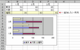 積み上げグラフの横に、あわせて他の傾向を示す棒グラフの項目を追加したほうが 視覚的にわかりやすいグラフとなるケースには、次のような方法でを使います。 図のような表を用意します。 また、[項目軸]の[軸の書式設定]−[目盛]タブで[軸を反転する(R)]にチェック を入れることで並び順の変更と追加データ部分を下に表示することが可能です。