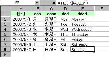 日付を表すシリアル値を曜日に変換する関数として、WEEKDAY関数がありますが、 結果は整数(1から7、あるいは0から6)として返されるため、直感的に何曜日か わかりにくい、という問題があります。 そこで、数値を指定した書式の文字列に変換するTEXT関数を使用します。 B列は「aaa」、C列は「aaaa」、D列は「ddd」、E列は「dddd」 の書式で、それぞれ日付を曜日で表しています。 なお、曜日形式で表示はしたいが、値はシリアル値で持っておきたい、という場合 には、セルの表示形式で対応してください。
