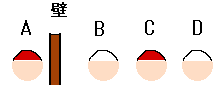 赤白の2色の帽子を被った人が各2名の計4名(仮にABCDとしました)左図のように並びました。 1.各自、自分の帽子の色は分からない。(但し赤2名、白2名であることは承知している) 2.後ろを向いてはいけない。(もちろん声を出して教えるのも不可) 3.前の人の帽子は見える。(壁に隔てられたAを除き) ここからが問題です。 他の人が全員に「自分の帽子の色は分かりますか?」と聞いたところ、 全員が「わかりませーん!」と答えました。 しばらくして、ある人が「分かった!」と言って正解を出しました。 さて、誰がどうして分かったのでしょうか? 私が「答えはD、理由は壁が低く、Dが背が高くて前3人が見えた」もしくは「天井にテレビカメラガあって、モニターで・・・」と回答しましたが全て却下されました。 答えを聞くと納得のいく正統派のクイズです。 |