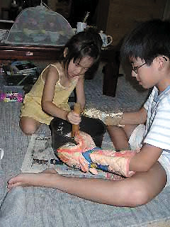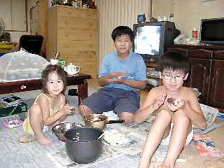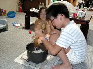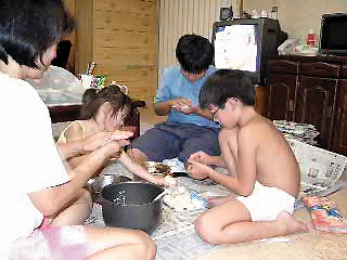 みんなであんこときな粉を付けてます。