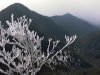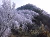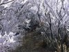 縦走路 12:17 ようやく、縦走路に達する。そこは、霧氷の世界であった。東風に乗った水蒸気が尾根状の東側の樹木に白い飾り付けをした。岩棚より、両手両足を動員した。勾配が強く、セーターを脱ぐことが出来ない。屈伸運動の繰り返しで、この山行きで初めての汗をかかされる。その汗も、稜線を渡る風で瞬く間に冷える。 |