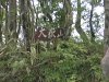 大岳山頂 14:50 相変わらず見晴らしの全くない山頂であるが、灌木の数が減ってややすっきりした雰囲気になっている。2カットで休憩無し。真っ黒い雲が日を遮り雨を心配する。山頂直下に真新しいロープが3ヶ所張られている。どうして?という感じの所である。 |