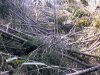 下山路 12:05 先ほどの分岐を過ぎるといよいよ倒木地帯にはいる。柳沢の支沢沿いに下るのであるが、沢沿いに倒木が折り重なって檜の墓場の様相である。この檜の倒れた幹の下をくぐれば、枯れた葉が首筋から入る。乗り越そうとして枝で体を支えようとすれば、簡単に折れる。上に乗ろうとすると、枝先で支えられた幹はバネのようにはねる。始末に負えない。 |