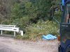林道に出る 12:18 山頂より1時間、愛鷹林道支線、柳沢橋のたもとに出る。今朝の登山口より50mほど奥まった位置にある。写真が小さくてわからないが、ガードレールの右端に白い大きな道標が「愛鷹山登山道入り口」を示している。倒木伐採中の工事資材、車両が遮っている。 林道を駐車場所まで戻る。 |