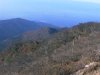 山頂より 9:12 越前岳より、南に続く縦走路を成す山並み。手前より呼子岳、蓬莱山、鋸岳その左に位牌岳と愛鷹連峰の核心部が続く。右には、二等辺三角形の均整のとれた大岳。大気が汚れている。すっきりと見通せない。 |