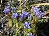 高場所尾根 11:30 私の定位置、高場所の広場。なんと今日は先客あり。二人の幼児を連れたパーティー。バーナーを炊いて昼食の準備中。今回は譲って、私は日溜まりを見つけて昼食としよう。昼食の相棒はリンドウ。台地状の尾根は植林されたヒノキがまだ、目障りにならない程度、今がこの尾根の楽しめる時かもしれない。東西にのびる尾根は日当たりがよい。ここはリンドウ街道。 |
