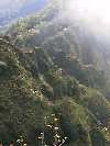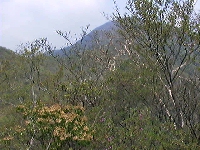 杉の天然林 13:43 位牌岳山頂から南進すれば袴腰岳から愛鷹山へ達する従走路である。 今日は、右手東の尾根を前岳に向かう。このルートは山頂を離れてまもなく、雑木をかき分けて進む歩きにくくなる。ルート上には、倒木が多く、そのたびごとに、踏み後を探すはめになる。前岳まで二度ルートを失い、上り返す失態を重ねた。下りはじめてまもなく、前岳より南に派生する尾根上に天然杉の林を望むことができる。この山域の天然杉は東面に散在している。植林内のそれと異なり、風格を感ずる。 |