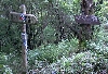 一ぷく峠 13:56 ここまでほとんど上がり下がりのない稜線歩きが続く。樹林の切れるところがなく、鋸の山稜もその全貌を視野に収めることができない。かって、鋸のビューポイントは袴腰岳の山頂であった。山頂の木が伸びた今、ここにその座を譲る。水神社への分岐でもある。 |