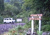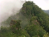 再び、須津川駐車場へ 15:45 第一展望台を過ぎるとすぐ須津川への下降が始まる。ヒノキの薄暗いこのルートは、滑りやすい赤土の中に足を置くことに集中する、我慢の時間を強いられる。ここでも、崩壊したところが2個所あり、ロープに頼る。 |