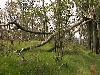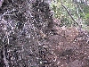 愛鷹山への分岐 14:45 馬酔木の林も10分ほどで、明瞭な尾根上の下降路に変わるとともに、左手東の斜面は檜の植林帯となる。全面なぎ倒された檜は、1年たった今でも後かたづけが続いている。倒木がルートをふさぎ乗り越し、くぐることの繰り返しで、腰の運動にはよいが、快適とは言い難い。ここは十字路、進行方向左には、つるべ落としの滝、右手には愛鷹山への登路になっている。 |