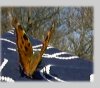 |  | ヒオドシチョウ♀ 13:50 天気がよい。3ヶ月ぶり、二日酔いと条件がそろう。0.47リットルのテルモス、1リットルの水筒、リンゴ1個、みかん3個。補給した以上の水分が老廃物とともに吹き出し、肌に触れているものをぬらす。男性の汗には、やはり雌を引きつけるらしい。 |